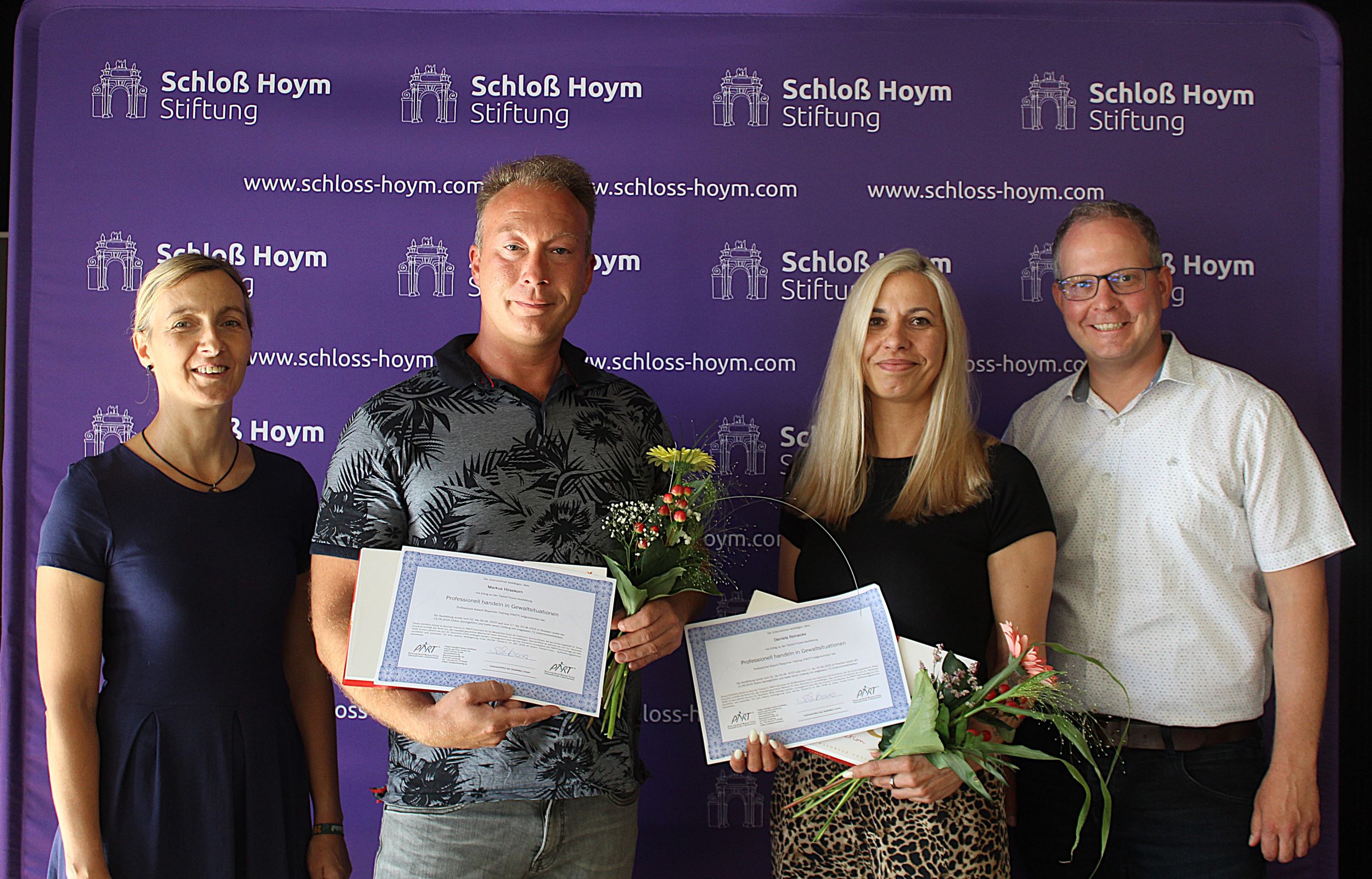 Verwaltungsleiter Carlo Scholz und Pädagogische Leiterin Eileen Greunke gratulieren Markus Hirsekorn und Daniela Reinecke zum erfolgreichen Abschluss der Zusatzqualifikation zum PART®-Trainer/zur PART®-Trainerin. PART® bedeutet „Professionell Handeln in Gewaltsituationen“. Einrichtungen wie die Schloß Hoym Stiftung sind verpflichtet, ein tragfähiges Gewaltschutzkonzept vorzuhalten und Schutz vor Gewalt aktiv zu betreiben.