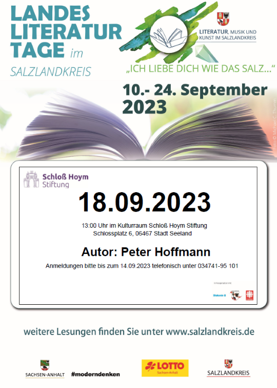 Am 18.09.2023, 13:00 Uhr findet ein Landesliteraturtag des Landes Sachsen-Anhalt unter dem Motto „Ich liebe dich wie das Salz!“, mit dem Autor Peter Hoffmann in der Schloß Hoym Stiftung statt.