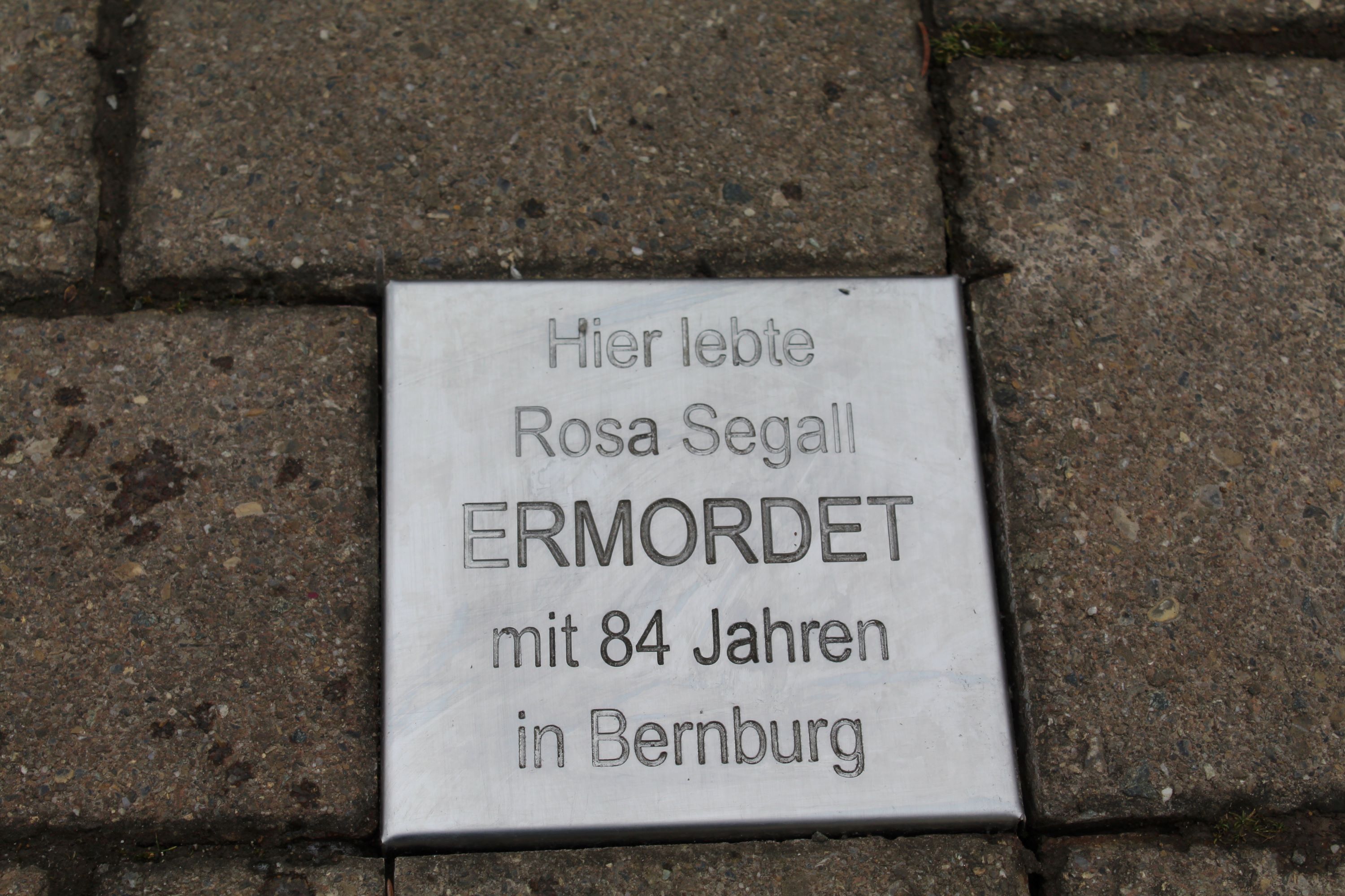 Am 27.01.2025 wurde zum Tag des Gedenkens an die Opfer des Nationalsozialismus eine Stolperplatte für Rosa Segall verlegt. Rosa Segall wurde im Alter von 84 Jahren in Bernburg ermordet.