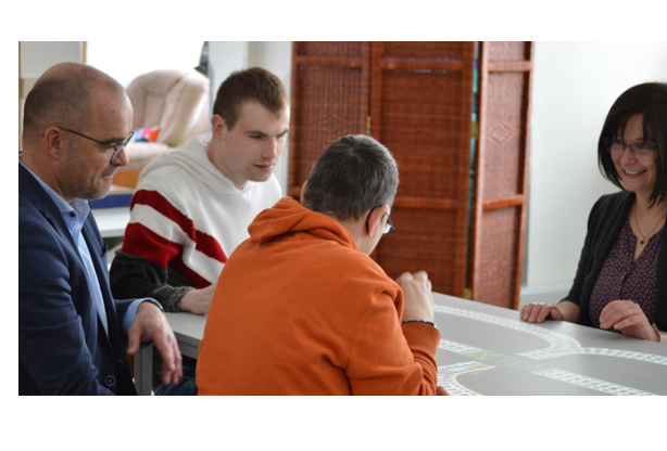 Die Bewohner Simon Otto, Raik Schnelle und Heike Maschinke sind begeisterte Spieler mit der Tovertafel. Marienkäfer werden gesucht, eine Eisenbahn fährt, wird durch die Spieler beschleunigt und Fische ziehen durch das Wasser. Die Bilder werden von einem Projektor auf eine Tischplatte projiziert. Durch Berührungen der Bilder lösen die Spieler Aktionen aus. Nichts kann umkippen und kaputt gehen. 32 Spiele stehen zur Verfügung und laden zu gemeinsamen Aktionen ein. Das Vorstandsmitglied der Schloß Hoym Stiftung Christiane Porst hatte davon in der Presse erfahren und wollte die Tovertafel einmal live erleben. Gemeinsam mit den Bewohnern und Ergotherapeutin Cindy Staufenbiel brachte sie Farbbälle zum Platzen, ohne dass die Hände farbig wurden und auch eine gemeinsame Runde Fußball stand auf dem Programm. Eine besondere Herausforderung stellte allerdings ein Marienkäfer dar, der sich zunächst nicht aus dem virtuellen Laub befördern ließ. Aber nach gemeinsamer Anstrengung fand sich auch dieser Käfer und flog zur Freude der Bewohner zu seinem Zielort.