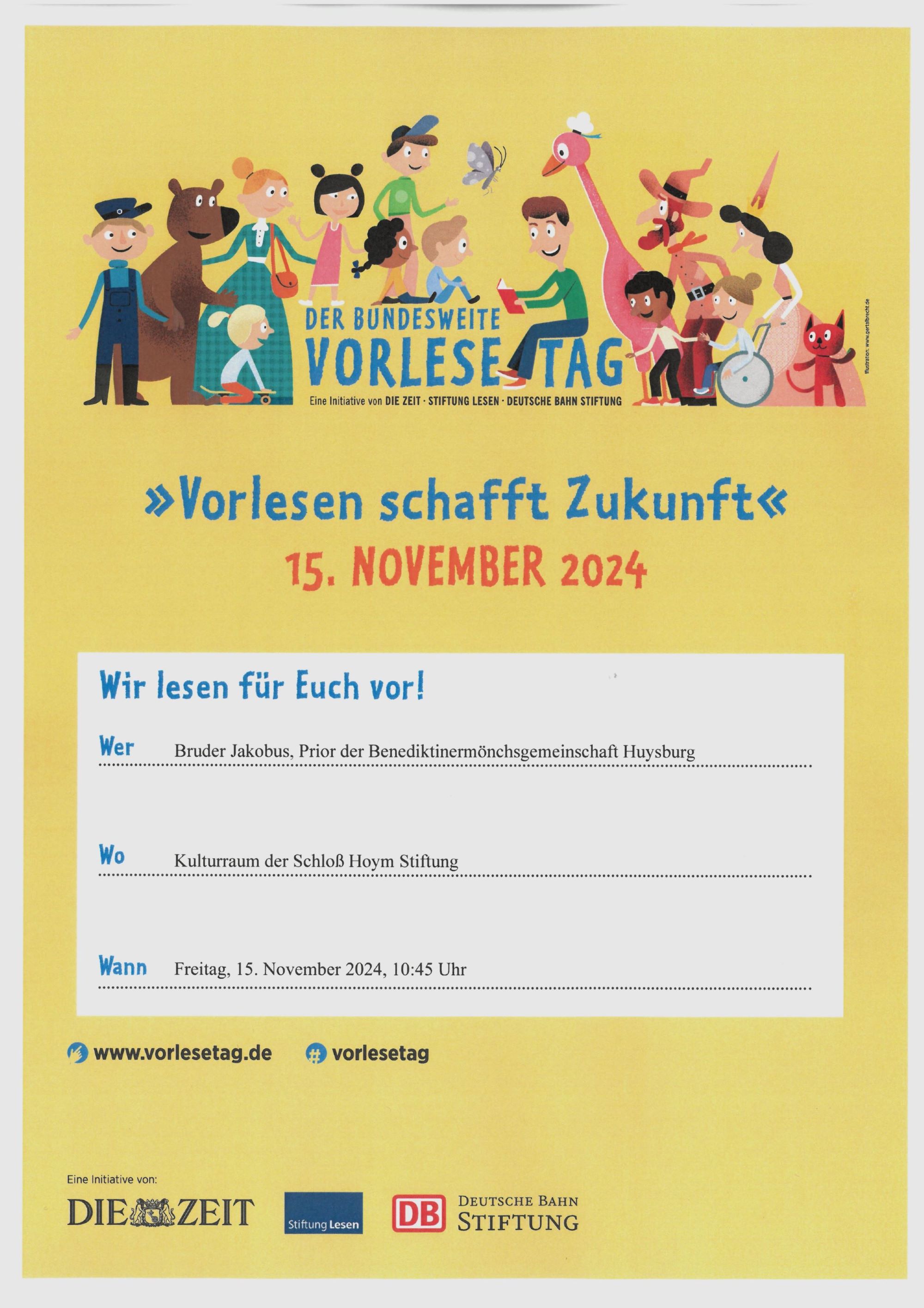 Der bundesweite Vorlesetag findet am 15.11.2024, 10:45 Uhr, im Kulturraum der Schloß Hoym Stiftung statt.