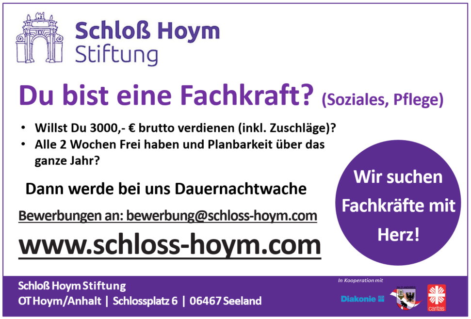 Rückfragen beantwortet Ihnen gern unsere Personalreferentin Sindy Plock unter der Telefonnummer 034741 95-104 oder per Email s.plock@schloss-hoym.com.