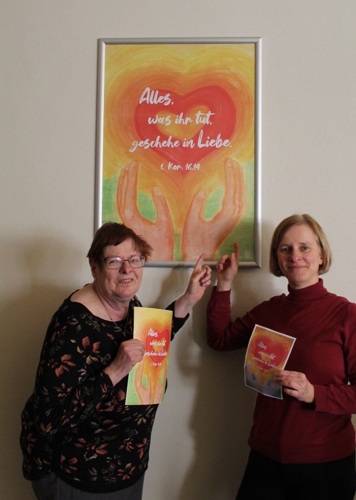 Dazu hat Frau Eveline Böhme, Bewohnerin des Hauses Elisabeth, zusammen mit Christina Härtling ein entsprechendes Poster ausgesucht. Beide sind Mitarbeiterinnen im Arbeitskreis Christliche Angebote. Besonders hat Frau Böhme die Farbe, aber auch die Form eines Herzes angesprochen. Auf allen Wohngruppen wurden die Poster verteilt und wir denken, dass man an diesem Spruch sehr viel „beherzigen“ kann.