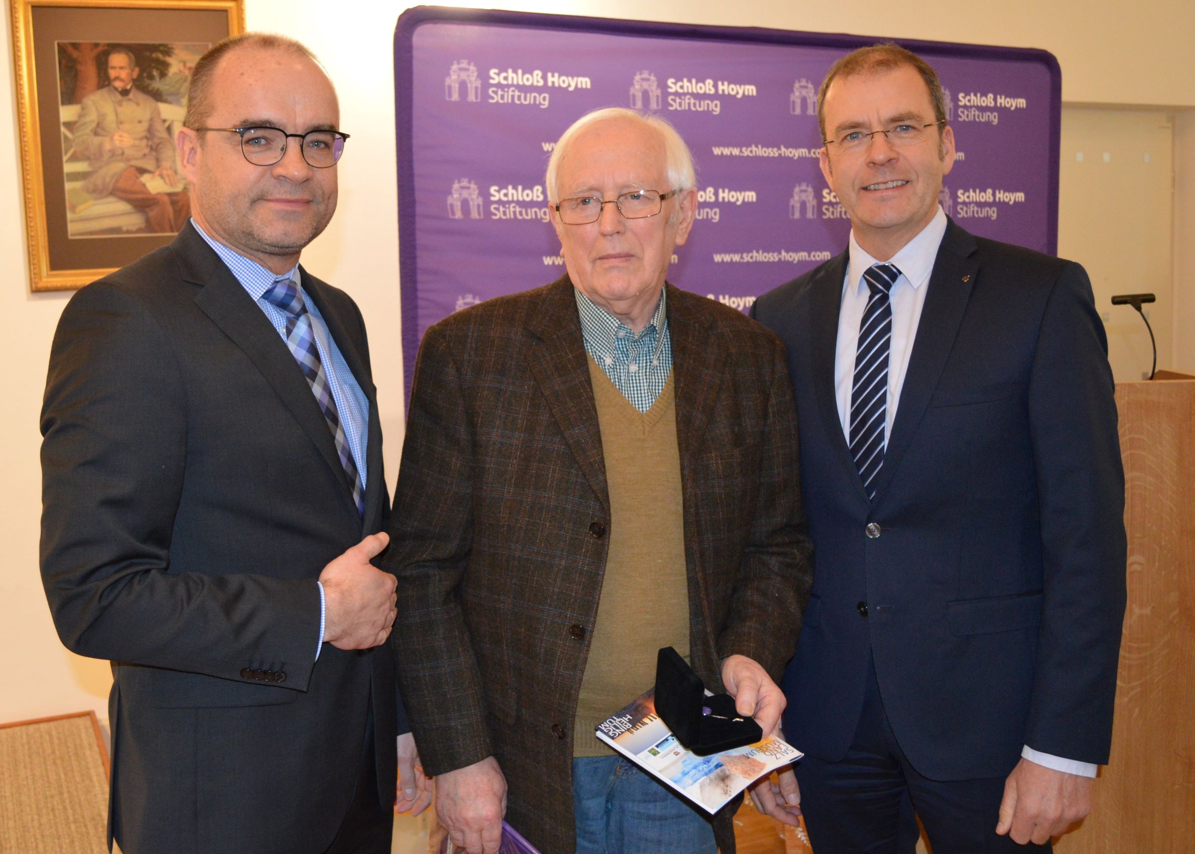 Eingerahmt in das Neujahrskonzert 2020 wurde Dietrich Genau mit der silbernen Ehrennadel der Schloß Hoym Stiftung überrascht. In der Laudatio von Herrn Hans-Michael Strube wurde deutlich, dass Herr Genau seit über 25 Jahren unterschiedliche Projekte der Schloß Hoym Stiftung begleitet. Wenn Sie die Zeitschrift "PORTAL" aufschlagen, dann stoßen Sie auf 2 Seiten mit Geschichten aus der Umgebung von Hoym, die Herr Genau all die Jahre gestaltet. Viele seiner Werke sind als Leihgabe im Schlossgebäude ausgestellt.
