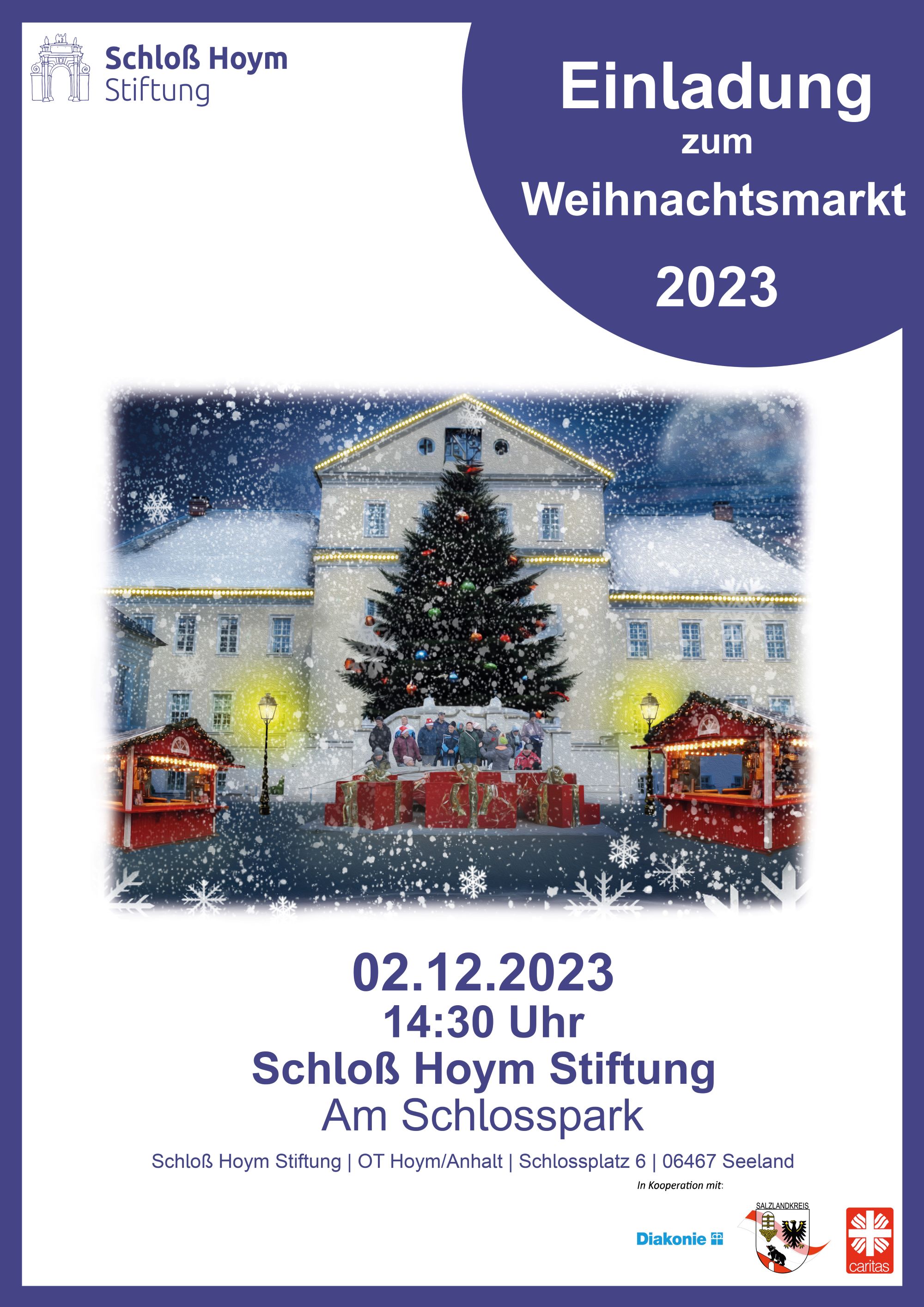 Der Weihnachtsmarkt in der Schloß Hoym Stiftung findet am 02.12.2023, 14:30 Uhr statt. Es erwartet Sie ein musikalisches Unterhaltungsprogramm und der Weihnachtsmann kommt gegen 16:30 Uhr mit der Kutsche.